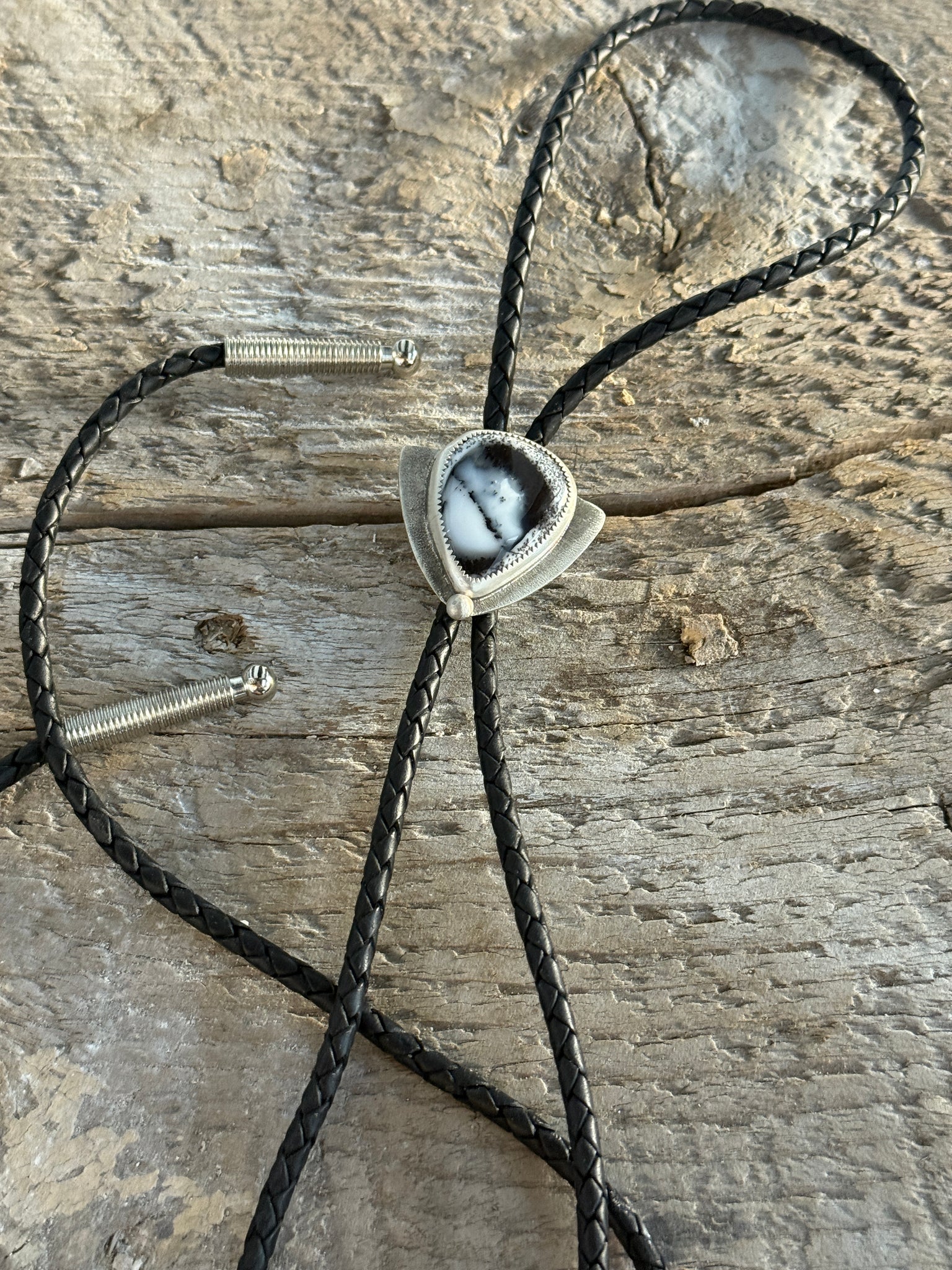 Sterling silver and black leather in a classic bolo style featuring a striking dendritic opal.  Wear it with your favorite white shirt and a pair of blue jeans or let it showcase an evening at dinner.  A strong and unique way to accessorize your collection.