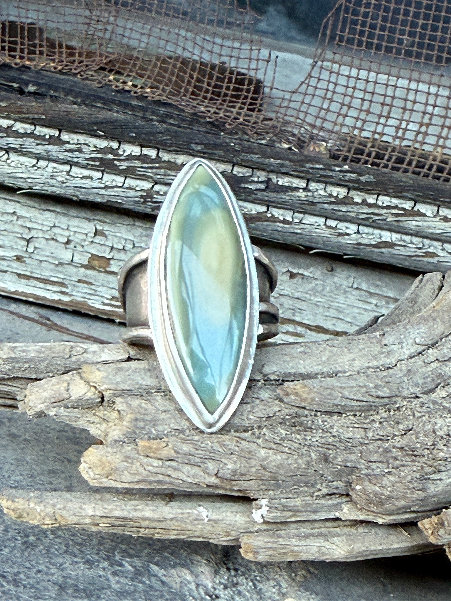 The soft whisper of green and taupe is a perfect focus for a classic marquis ring. Imperial Jasper, is considered one of the finest varieties of jasper. It symbolizes grounding, and strength, bringing focus and balance to the mind and body. It's creamy colors range from soft ivory to greens, pinks and browns.