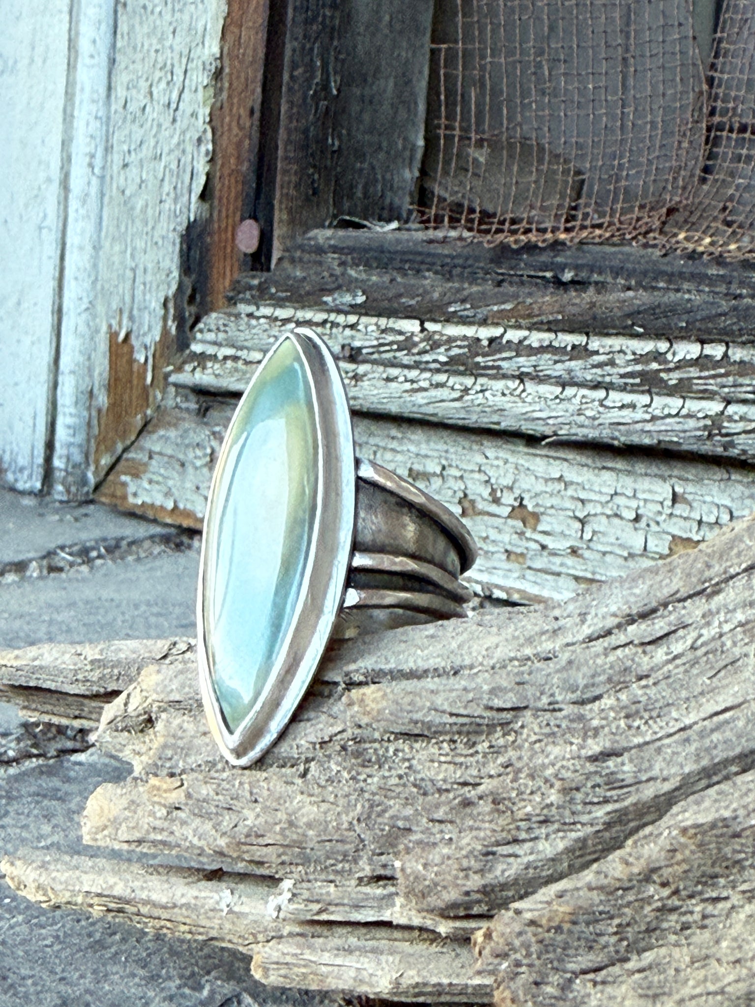 The ring band is crafted with fine silver wire accents, with unusual shape and interest;a stunner that stands alone in its beauty .