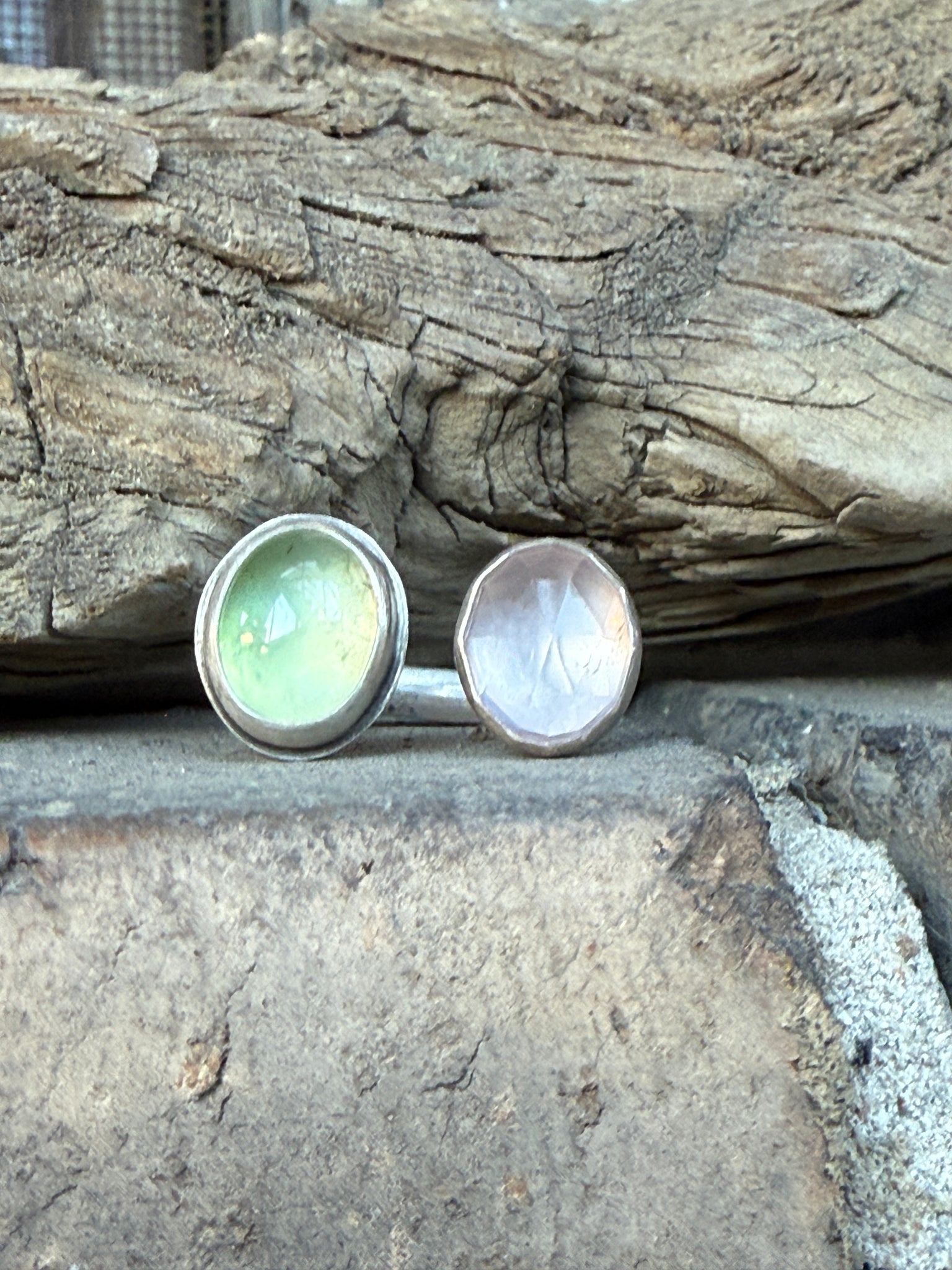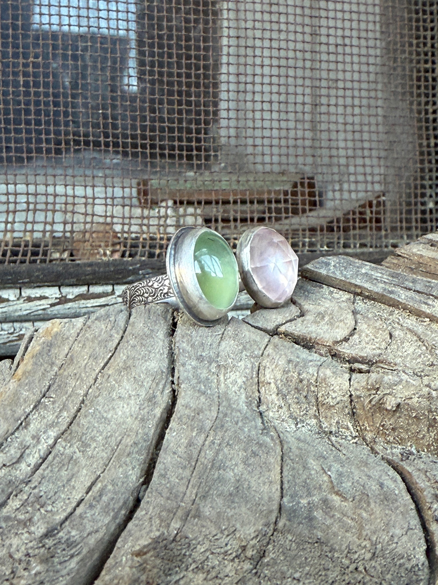 Green and Pink. Faceted Rose Quartz and lustrous green Prehnite are the perfect partners in this adjustable ring. The patterned silver band gives just the right touch of interest, leaving the stones as center stage.