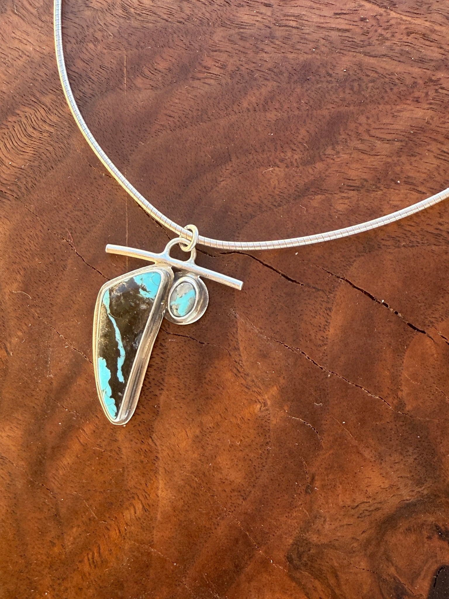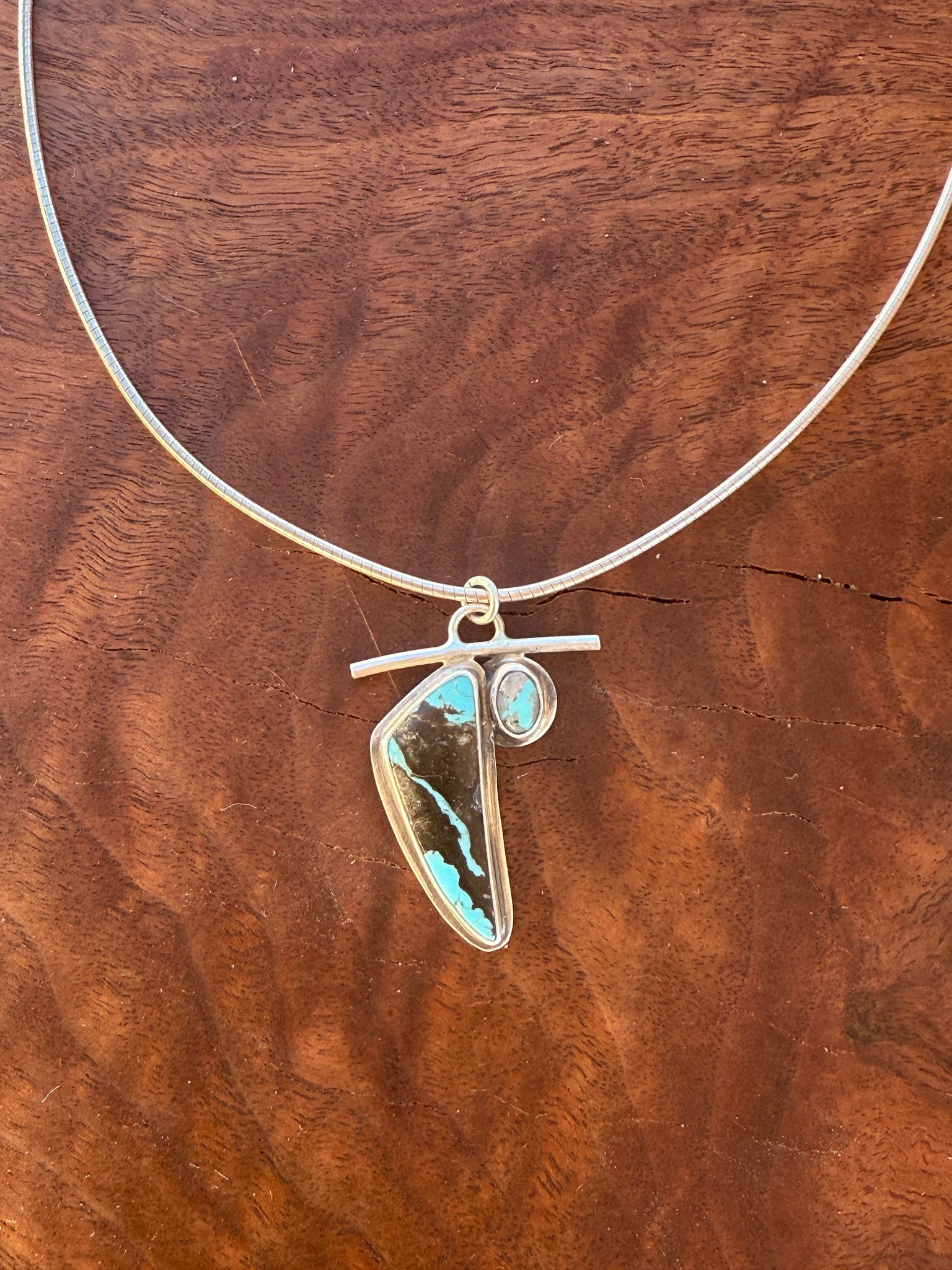 When lines and curves keep company. A Lovely mix of soft blues and a rich black canvas of turquoise set in sterling. Set with geometry in mind, the lines are accented by a flexible curved sterling neck wire- creating a unique pattern that’s truly one of a kind.