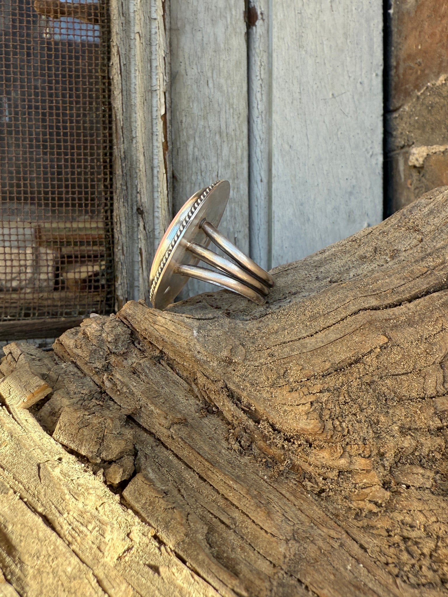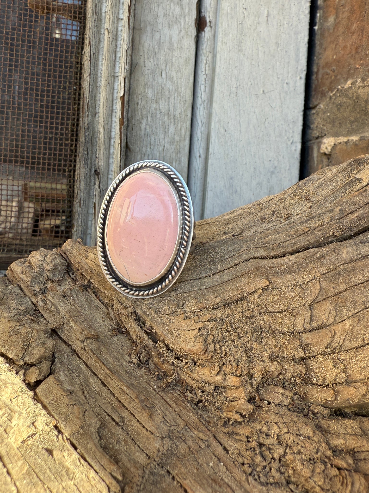 The soft blush of pink is a perfect focus for a classic oval ring. Surrounded by twisted silver wire and triple ring shank, this stunner stands alone in its beauty .