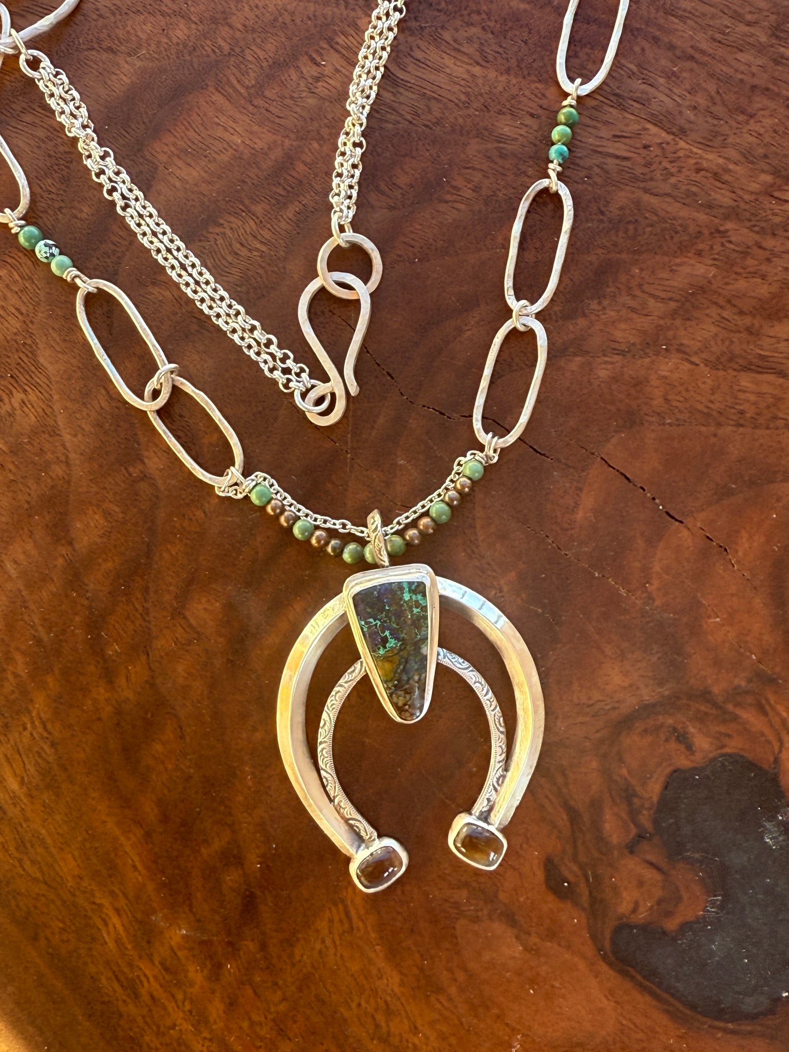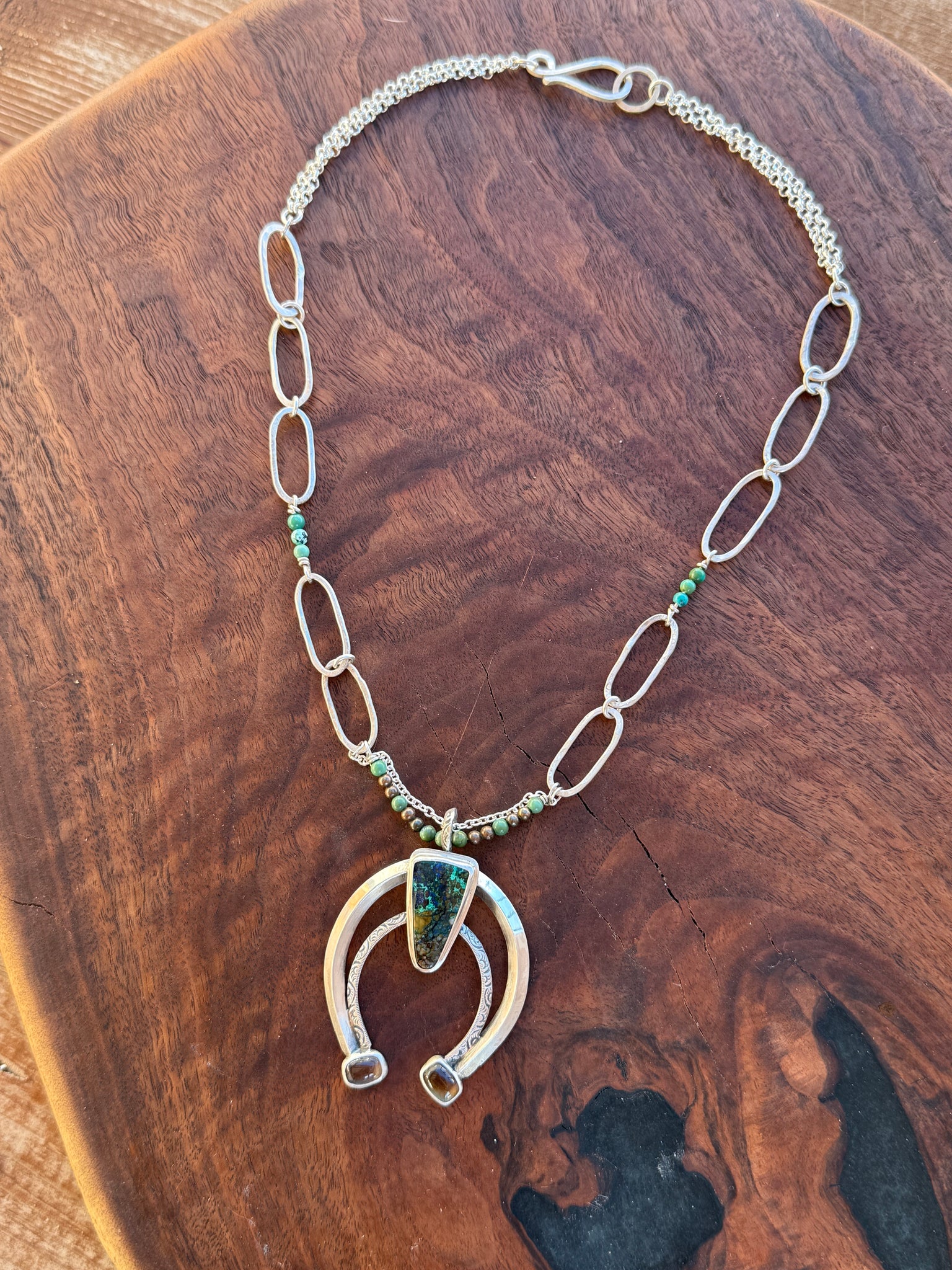 Introducing an exquisite piece of jewelry crafted to embody the timeless allure of the crescent Naja. This captivating creation features a gorgeous Chrysocolla and two accent smoky quartz ... each stone telling its own story of history and natural beauty. The Naja, with its elegant curves, symbolizes protection and strength, making this piece not only a stunning accessory but also a meaningful talisman.